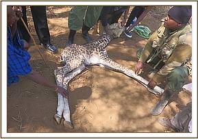 The giraffe was reported by Amboseli National Park Community Warden as being stoned by young children who were following it from nearby Maasai Manyatta.