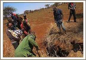 We thought and attempted to cut down one side of the well by digging but it was very hard due to stones. This also was not forthcoming. Instead we tried to create a slope for the elephant to climb out. We carefully threw in the well avoiding hitting the elephant all dead woods which were around, stones, and hard mud bricks from one edge to create a slope. We then placed the strap from front all the way round through the gluteal and manually by use of seven men tried to support it out as she climbed out. It was amazing how she easily and calmly she eventually came out. We left it under keen watch of the community ranch scouts as it trailed the family members.