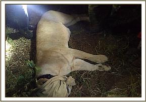 The lioness was spotted alone within thick bushes near a herders’ settlement where it had been preying on livestock. After getting everything ready at the site, bait was placed within an adjacent open area on the bark of a tree in order to lure the lioness out of the bush. It had been known to raid just before or after the fall of darkness. Thus the operation was planned to start as early as eighteen hundred hours. We set oursleves near the bait while the other two cars waited about four hundred meters away. Once the cattle from nearby grazing fields were rounded up in bomas, and there had been at least ten minutes of silence, a callback of a distressed calf was played through a phone. Amazingly the rather inaudible call lured the lioness out of the thickets just after eighteen hundred hours. She was known to be alone. Dart was ready, constituting of 450mgs Ketamine and 6mgs Medetomidine, was loaded into a three centiliter dart Dan-Inject dart gun. She was to be darted by vehicle. After coming out the bushes, she noticed the vehicle near the bait and also the other vehicles further away. She felt shy to come closer to the bait and instead kept some distance whilst keeping her concentration on the vehicles that were further away. She walked fifty meters away from the bait and we decided to follow her quietly in order to have a chance at darting her. We intercepted her slowly and she went down on her sternum still paying attention to the direction of the vehicles in the distance. This was our opportune moment and we were able to dart her on her right thigh at twenty past six in the evening. As she got a fright she sped off into the opposite thicket about thirty meters away. We quickly followed on to discover her inside one of the thickets. We called in the other two vehicles as we maintained keen observation. After seven minutes she was on sternal recumbence followed and shortly after she was on her right lateral recumbence. We neared to the thicket, establishing that she was completely anesthetized we blind folded her with a towel and moved her out to an open area so we could easily collar her. The collar was completely fixed twenty minutes after darting her and the biometrics were done by Lion Guardian personnel. Upon examination she was found to be in plenty good health with excellent muscle cover. Only Amoxicillin 2000mgs was administered into her muscles for any opportunistic pathogen strike. Both eyes were covered with eye ointment as well as the dart wound.