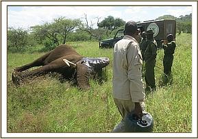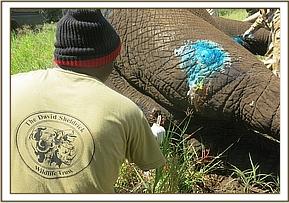 The bull was found at the waterhole, in the company of another huge bull, splashing water on his body, probably to relieve the pain from his wounds as he seemed to really be focusing on them. After observation, it was found that the bull had at least four pus exuding wounds, and that an intervention was paramount. A 3cc dart constituting of 18mgs Etorphine was loaded into a Dan-Inject Gun. The team approached the bulls slowly via vehicle. The bulls had already begun to slowly move away from the watering hole. After a couple of minutes the team was able to successfully dart the bull on the mid left arm. The bull gave a few quick bouts trying to remove the dart, but he settled after a couple of minutes behind a thicket and started spraying soil on his wounds and the rest of his body. The other bull oblivious to what was happening strolled away quietly. The bull remained still for several minutes before exhibiting standing anesthesia. He was down on both carpi supporting his head with his strong tusks. The team of ten pulled the bull onto his left lateral recumbence by wrapping a rope around his pelvis. He was blindfolded using his right ear and his trunk was kept open with a piece of stick placed across the distal nares. Water was doused on his ears to help cool him down.
