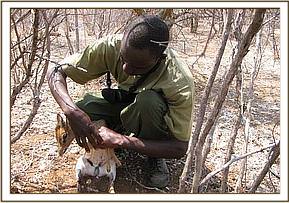 Most of the animals targeted by poachers in this area are small animals such as Dikdiks and antelopes. We came across two dead snared Dikdiks and were able to rescue one snared Dikdik.