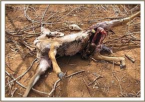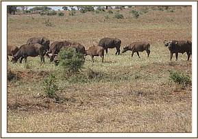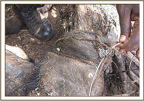 A buffalo with two snares, one around its neck and a second around its leg, was seen at the Athi River dragging a log. We followed the buffalo for three days to the trust house where it hid in the reeds.