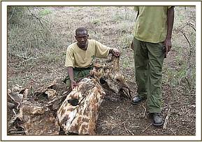 Later in the month, our operations began at Iltilal which is south west of Tsavo west National Park and is an area that is adjacent to the park. The local people in this area are from the Maasai community. The area has a lot of wildlife species both biota and fauna but has a lot of poaching problems from the armed Chagga community from Tanzania. The area is home to Wildebeest, Kongoni, and Buffaloes. Rhino footprints have also been seen near water points. The vegetation in the area is sparse in terms of Shrubs but is thickly grassed with a good cover of acacia trees, which is dominant in the area and is a source of food for giraffes and other browsers. Due to the abundance of wildlife in the area and the lack patrols by KWS personnel, poachers from Tanzania have been engaging in night poaching in the area. The nearby KWS posts do not have a vehicle that they can use to carry out larger patrols and are thus not a threat to the poachers. During our patrols in the area we came across the carcasses of 3 poached giraffes