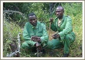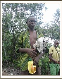 The month’s patrols were done in conjunction with the Mtito desnaring team. This is due to the fact that the Chyulu team leader is in the process of training the new Mtito team leader. While camping at Kenze the teams patrolled all sides of the Kibwezi forest during both the day and night. With the advantage of an excellent view of the whole area, the teams managed to arrest 18 people either carrying charcoal or wet wood, or in the process of preparing the kilns or cutting trees. Most charcoal burners operate at night under the light of the moon or with torches. Some of the culprits were arrested at 8.00 pm while others were arrested at dawn.