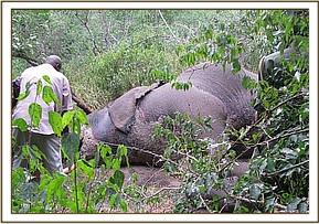 Early in the month the Umani Camp staff sighted a bull elephant in great distress suffering from severe wounds on the front leg and chest. The Chyulu Team alerted the David Sheldrick Wildlife Trust Headquarters who organized a rescue team with a KWS Vet to fly from Nairobi to Umani in an effort to save this elephants life. The Vet landed at about 5pm and the Team accompanied him to the sight of the injured elephant. The elephant was darted and closely examined.