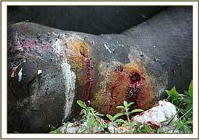 Unfortunately cases of human-wildlife conflict are very high and it is most likely this elephant was attacked by a farmer trying to protect his land. There are plans to build an electric fence along the forest boundary to prevent this kind of conflict.