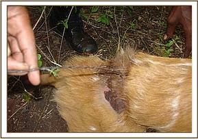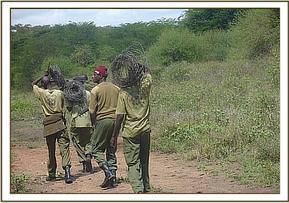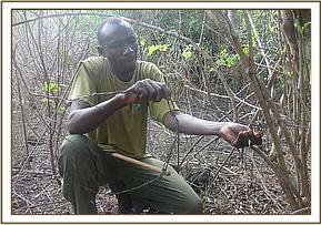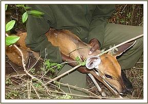 KIBWEZI FOREST After its patrols in the Kiboko area the team moved to the Kibwezi forest where it lifted 32 snares targeting medium sized game. The snares were found on the south eastern side of the forest. The team came across a bush buck that had become trapped in a snare. The bush buck was still alive and we were able to remove it from the snare.