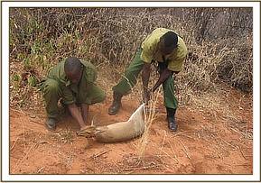 Mbulia ranch This ranch borders Tsavo East national park and is a vital migratory corridor as the Ndii electric fence ends near the ranch. It allows grazing and browsing mammals to cross from the park to the ranch. During our operations in this area we lifted 99 snares, 23 of which targeted large game with 76 targeting small game. The remains of a snared Dikdik were also found.