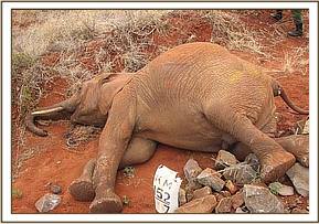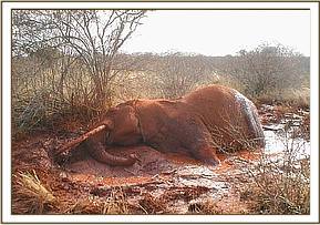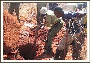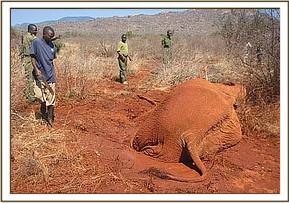 Towards the end of the months desnaring operations the team came across an elephant that had gotten stuck in the mud along the Mzima Springs water pipeline. The water pipe had burst and the area had become water logged. The elephant got stuck in the mud when the herd passed by and stopped to have a drink. The Burra desnaring team worked together with the Tsavo vet team to dig the elephant out and free it.
