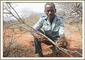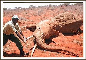 At the Tsavo River footprints were seen along the river bank that led us to snares and the remains of a rotting elephant.