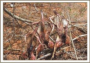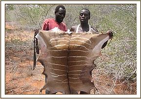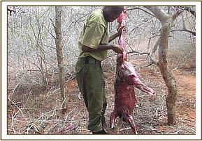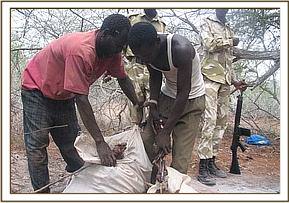 Kizingo ranch. Aerial surveillance of the Southern side of the park revealed a snare fence near Kizingo ranch. Snare fences are a common snaring tool whose purpose are to keep animals on designated routes on which snares have been set. Sadly it is a rather efficient poaching method with the poachers trapping a large number of animals. With the help of a KWS pilot we were able to follow the fence and locate the poacher’s hideout. With the use of GPS co-ordinates we located the hideout on the ground and were able to arrest two poachers. Sadly another two of their accomplices were able to evade arrest. The poachers were in possession of game meat from 20 Dikdik’s, 2 lesser kudus, one porcupine and two guinea fowls, in total weighing about 100 kgs.