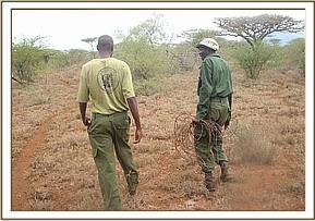 Mgeno ranch Borders Taita sisal estate and is east of the Mwatate Township. It is about 50,000 acres and is owned though shareholding by about 400 members. The vegetation is mainly bushy acacia-commiphora. The ranch has two dams which have water year round and are thus a vital water source to the wildlife in the area. We lifted only one snare during our patrols with one of the herders. We feel that the herders are probably engaged in poaching as they were reluctant to show us around the ranch. The ranch manager is collaborating with charcoal burners by allowing them to set up kilns in the ranch in return for a cut of the profits.