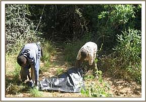 During the second week of the month the team set out on a de-snaring exercise which started from the Mkua-Nima park boundary. Along the park boundary we observed that people are entering the park in order to cut building materials for building food stores. Charcoal burning is prevalent both inside and outside the park. Some people enter the park in order to cut trees into small portable pieces and then transport it out of the park for charcoal burning.