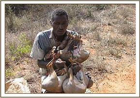 During the 2nd week of the month the team camped at Gazi area. The team made plans together with Mtito team to combine our efforts to tackle this areas ever increasing poaching and illegal grazing, and logging problems. Together we patrolled from Buffalo Bent upstream and managed to make 3 arrests, 2 of which were serious loggers and the other was caught setting snares. The Team was surprised to learn that this particular poacher was educated up to Form 6 Level. He confessed to trying to outsmart the team by staying behind us as we patrolled. He was in possession of 43 snares targeting small game. He was arrested and booked at Mutomo Police Station.