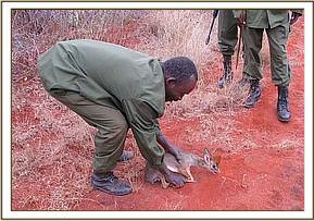 Nthalakana airstrip, Sheldrick blind and Macho-Kobo Our aim in these areas was to check all the water points as these area the areas where poachers are erecting shooting platforms from which they are better able to target large game. While carrying out our patrols we came across some footprints that began at the Athi River and went all the way across the Yatta to the Tiva River in the Northern area of the park. We found a dead Dikdik in a poacher’s camp and also found a snared baby Dikdik.