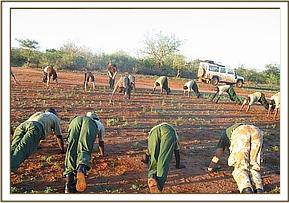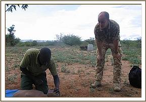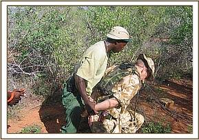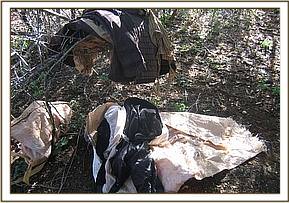 Near the Gazi hills we encountered fresh footprints which we were able to follow all the way to Mukameni Village to a hut that we were informed belonged to a habitual poacher named Mule wa Makila, who was not around. In his compound we found Didkdik fur, a pile of small bone and skulls and a tree stump that had fresh blood on it.
