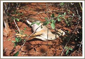 Between the power line and the Kasaala gate we came across footprints which led us to a snared Didkdik. The surrounding area yielded 16 snares all of which targeted small sized game.