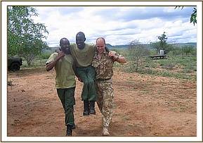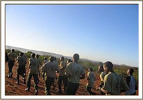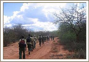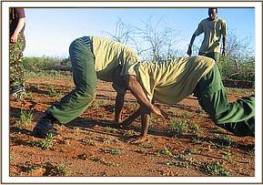 The British Royal Marines joined the de-snaring teams in the field from the 23rd of May for a period of four days during which we patrolled the Gazi area with them. On the first day of our patrol with them we traced footprints to the edge of the Yatta where we found a poachers hideout. We set an ambush but were unsuccessful. We felt that the poacher may have seen our footprints, which had been left while removing snares. As we advanced upstream we found more footprints and suspect that they were from honey hunters as this is the season that they illegally harvest honey inside the park.