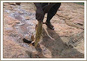 This month the team dedicated its de-snaring efforts to the setting up of observation points and the laying of ambushes. The team decided to change its strategy in order to enable it to arrest the poachers who have been reported to be entering the park on a daily basis. This change in conjunction with the gathering of information was successful and the team was able to arrest 4 poachers, unfortunately a fifth poacher was able to evade arrest. One of our informers was able to show us how in the dry season the poachers extract water from narrow holes using grass tufts, allowing us to see how even in the dry season poachers are able to remain in the park for long periods of time.