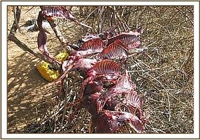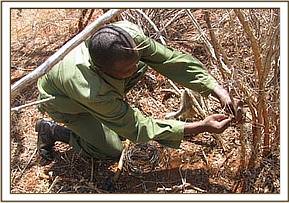 Mathae, Powerline, Chamanyenze and Kyae rock Our patrols in these areas yielded 55 snares 8 of which targeted large game with 45 targeting small game. We came across a dead snared Dikdik at Mathae and followed some footprints which led us to an area that had been heavily logged.