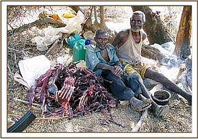Tundani, Macho-kobo and Umauma During our patrols in the above area we came across several sets of footprints which led us to an area near a water spring where we were able to arrest two poachers in their camp. The poachers were in possession of a bow and two poisoned arrows, approximately 200kgs of bush meat and an axe.