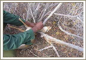 This month’s patrols were a follow up of last months due to the fact that we received information that after visiting an area and lifting the snares the poachers return once we leave and set fresh snares. We also learnt that the poachers found that we had been concentrating our activities far from the headquarters and thus this month had set snares near the park headquarters. We followed poacher’s footprints from the fence line to an old mudbath, a distance of 10 kilometers, during which we lifted 46 snares that targeted small game. One of the reasons that they are targeting this area is due to the availability of water. Poachers tend to set snares where animals come to drink as it makes them easy targets and also allows the poachers to monitor their movements and behavior.