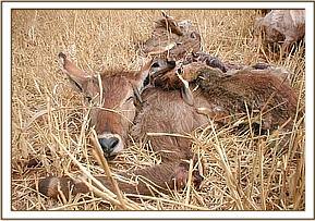 Tundani and Kyamanyenze were normally hot spots for poaching activities during the dry season because animals concentrated along the Tiva River due to availability of water and grass. On our patrol we bumped into a poacher who managed to escape and left behind his sandals and seven Dikdiks. We followed his tracks and in the process lifted 145 snares, three Dikdiks, a bush buck and a lesser Kudu, all found dead.