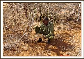 During our patrols at the junction of the Kambu and Athi rivers we found no snares which means that the poachers have either given up snaring or have relocated moving further inland. It is unlikely that they have given up poaching and what has probably happened is that they have moved their operations to another area. This fact was corroborated by the fact that once we moved upstream we came across a frequently used poachers track. Upon searching the surroundings we discovered that the area had been heavily snared and that the snares had simply been removed and hidden before our arrival. We immediately laid an ambush. Two hours later a poacher named John Nyamai who was in possession of a panga and a sack.