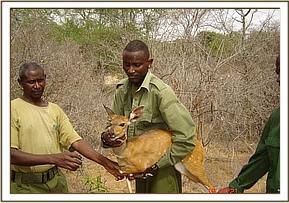 During our patrols along the Athi River we came across a young bush buck whose back leg had become caught in a wire snare.