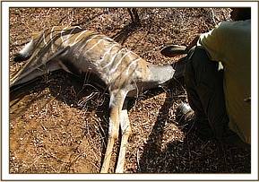Our patrols were then moved to the Mtito River, covering the area towards Ngiluni. In the area between the park and the community land we managed to lift 9 large snares and 31 small snares. Unfortunately we also came a across a dead snared lesser kudu.