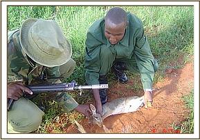Maktau, Lumo Community Sanctuary It has been established that night poaching is a very serious problem at the Lumo Sanctuary. The only problem we encounter in arresting poachers in this area is the fact that there isn’t a specific track that can be used by us to lay an ambush. We organized a number of night observations at strategic points but were only able to confirm what we already knew, that night poaching is taking place. Poachers were seen poaching inside the sanctuary at night, but we were unable to approach them in the dark as it is too risky. During the day patrol, we observed blood stains where Dikdiks were slaughtered during the night. We found a dead Dikdik which had been cut by the poachers but as it did not die immediately they lost track of it in the darkness.