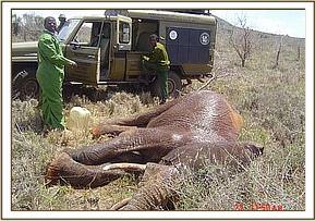 Towards the end of the month’s operations we visited the Lumo Wildlife Sanctuary where no illegal activities were noticed. We however did come across a six year old elephant calf that was found to be limping. We notified the vet who came and with the team’s assistance examined the elephant and found that the calf’s front right foreleg was swollen.