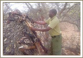 During the operation the team lifted a total of one hundred and twenty two (122) snares in all the areas patrolled. Out of which fifty nine (59) targeted big game and sixty three (63) targeted small and medium game. The team also came across several carcasses one of an elephant calf, one of a Giraffe, two for zebras. The elephant calf was suspected to have been killed by the current drought but the giraffe and the two zebras have been killed through poaching (snaring). A poacher was arrested and handed over to KWS authorities for more investigation and to book him. The poacher was in possession of over fifty (50) kilos of bush meat (dikdik and eland meat) which is suspected to have come from the Taita wildlife sanctuary.