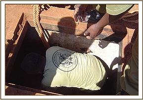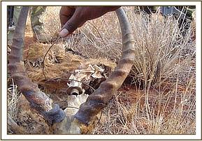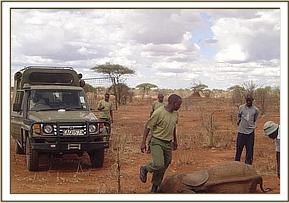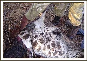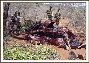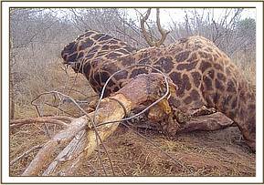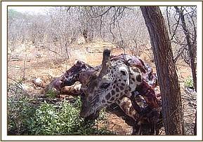 Tsavo River and Mzima water pipeline The above two areas were patrolled at the beginning of the month for a period of eight consecutive days. This area has recently been classified as an intensive protected zone. This is due to the fact that some of the black rhinos from the Ngulia Sanctuary have been allowed to venture outside the sanctuary in search of browse. A through check of all the main riverbeds was conducted as these areas are usually very active in terms of snaring. We also checked all the breather points at the Mzima water Pipeline. We came across footprints from three individuals which were several days old. The footprints led us to the carcass of a slaughtered snared giraffe.