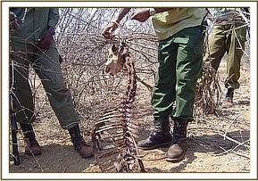 A visit to Kishushe ranch and the areas around the Mukuru River yielded no snares. We tried to locate an elephant that had been killed by poachers. We found out that the elephant had been killed using a strong poison which consequently killed the six dogs that had feasted on the carcass. The poachers warn the villagers that the meat is contaminated and should therefore not be eaten by painting an X on the dead elephant.