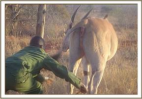 On the Lumo Community Sanctuary Maktau boundary, the David Sheldrick Wildlife Trust's Ziwani Desnaring team was called for an emergency rescue of a snared Eland that had become entangled in the security fence. What complicated the operation all the more was the fact that the Eland had allot of movement despite the tight wire around the neck.