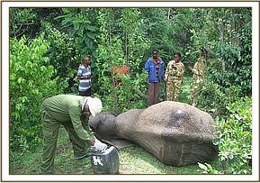 Immobilization was achieved by use of 13mgs etorphine delivered through daninject darting system. It took eight minutes for the drug to take full effect.