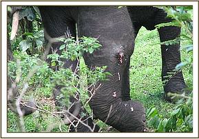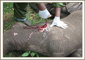 On examination, the elephant appeared to have been injured on the front left leg specifically at elbow joint. The injury seemed to have been inflicted by a sharp object most likely a spear. Other wounds were seen around the withers left flank and caudally at the left rump. The wound at the elbow was severe involving the joint capsule and was septic. All the other wounds were shallow and dry.