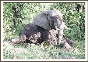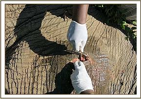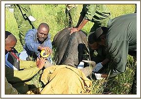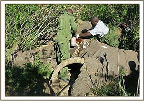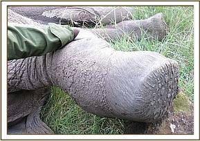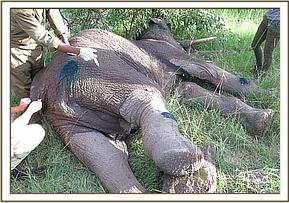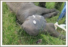 Immobilization was achieved by administration of 14mgs etorphine hydrochloride through a 2ml Dan inject dart by vehicle. The drugs took effect after 8minutes with the elephant falling on her left side. Examination revealed a suspected arrow wound on the medial surface of his right tarsus causing severe swelling of the joint. Other shallow wounds were seen on the lateral right hip and lateral surface of the right carpus.