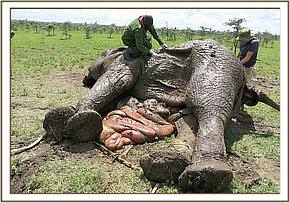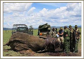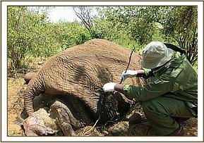 This elephant carcass was discovered by Masai mara game rangers while on routine patrol and the chief park warden informed the mobile veterinary unit. He requested for a postmortem to be carried to ascertain cause of death.
