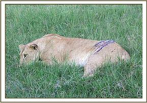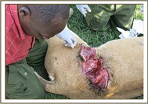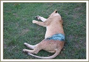 Siena is a mature lioness aged 8 years. She is a mother of several members of the famous Mash pride. She is a successful hunter and currently nursing three cubs who are four months old. She got a bad injury after being gored on her left flank by a buffalo while hunting with other members of the pride. First treatment was carried out on 4th April 2014 and second assessment which involved replacement of fallen sutures done on10th April 2014.This time round the wound appeared wet and required cleaning and antibiotic application.