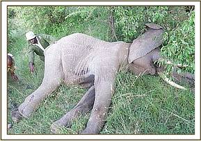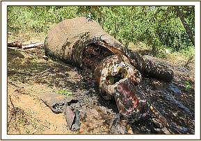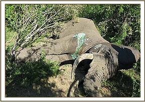 The carcass was found on sternal recumbency already putrefied and scavenged on. 3rd stage Maggots were beginning to infest the carcass. The anterior body parts were already dismembered by scavengers and predators including lions that were found on the site. A spear was retrieved about 20meters from the carcass most likely having fallen just before the elephant died. Both tusks were intact. The elephant appeared to have been in good body condition before death. The carcass was about five days old.