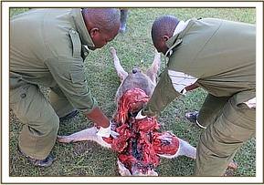 The pattern of deaths, post mortem picture and strange substances found in the stomach of this hyena suggest poisoning as the cause of death. All carcasses collected were dumped into a twenty feet deep pit and buried and contaminated areas burned by help of petrol. County staff were advised to comb the area and collect any other carcasses and treat them in a similar way to minimize exposure. The type of poison used will be known as soon as the samples are tested by Government Chemist where the samples have been submitted to.