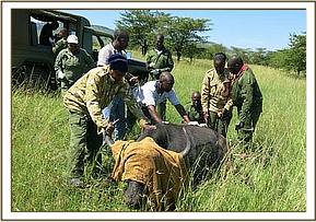 Immobilization was achieved by use of 5mg etorphine HCL and 50mg azaperone delivered through Dan inject darting system. Reversal was achieved through intravenous administration of 36mg diprenorphine HCL. The exercise was successful.