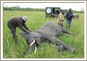 A mature healthy bull was identified as a candidate. He was immobilized by use of 17mgs etorphine hydrochloride delivered through 2ml Dan inject dart by vehicle. The elephant was fully immobilized in eight a minute upon which five pints of blood was collected from ear vein. This was immediately sent for processing by competent laboratories.