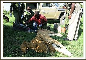 Immobilization was achieved by use of a combination of 3mg dexmedetomidine and 280mgs Ketamine delivered through a 3ml Daninject dart. Lioness was fully anaesthetized after five minutes. Examination revealed a discharging wound which required dressing but the sutures were still intact. Treatment involved cleaning the wound carefully with swabs and surgical spirit, application of iodine and cloxacillin antibiotic cream. Green clay was then applied.
