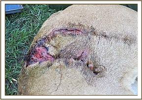Closer examination revealed a deep sharp edged wound about 2 inches in diameter on his right flank. This was a penetrating wound suspected to have been caused by spearing right into the peritoneum and the large intestines. Fecal material was seeping through the opening.