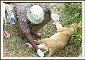 These cubs were in four different litters distributed within a radius of 300meters with each lioness watching over her litter. There were seven cubs in total and all were affected with various degrees of paralysis; some completely prostrate while others displayed posterior ataxia to complete posterior paralysis though very alert. No nervous signs or any discharges were seen from these cubs. Two cubs were reported not to have been affected had since moved away from the area.