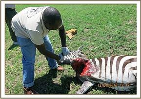 The zebra was immobilized with a combination of 5mgs Etorphine and 50mgs Azaperone delivered through a 3ml Dan-inject dart from a vehicle. She moved for 50 meters and stood still before giving in to anesthetics after eight minutes. She assumed sternal recumbency position and was pushed over to lie on her right lateral position for better examination. The wire had caused severe damage, with the left limb literally hanging, being attached proximally to the body by small tissue. The snare wound was also septic.