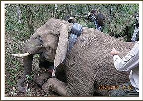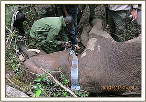 Immobilization for purpose of collaring was scheduled in the cool hours of morning. This was achieved by use of a combination of 1.3mgs Medetomidine hydrochloride and 130mgs Ketamine delivered in a 3ml Dan-inject dart from a vehicle. She became completely anaesthetized after seven minutes and a blindfold was put in place and Cloxacillin ointment applied to both eyes.